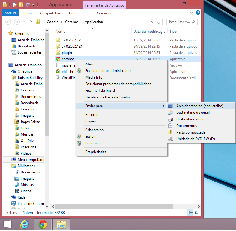 4º clique com o botão direito do mouse no arquivo selecionado, vá em Enviar Para > Area de Trabalho (criar atalho)